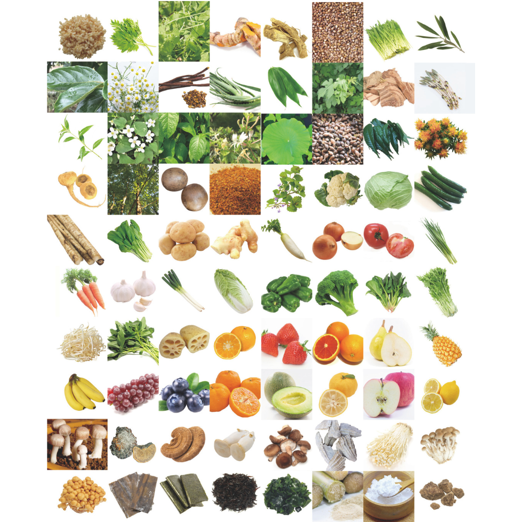 アガリクス,アシタバ,アマチャズル,甘夏,イチゴ,ウコン,エゾウコギ,エノキ,エビス草の種子,エリンギ,大麦若葉,オリーブ葉,オリゴ糖,オレンジ,貝化石,カキの葉,カミツレ,カリフラワー,カンゾウ,キダチアロエ,キャベツ,キュウリ,熊笹,桑葉,黒糖,ゴボウ,小松菜,昆布,サラシア,椎茸,シメジ,ジャガイモ,生姜,スギナ,センシンレン,粗糖(国内製造),大根,タマネギ,ドクダミ,トチュウ葉,トマト,ナシ,ナメコ,乳酸菌発酵液,ニラ,人参,ニンドウ,ニンニク,ネギ,海苔,パイナップル,白菜,ハスの葉,発芽玄米,ハトムギ,バナナ,ピーマン,ヒジキ,枇杷の葉,ブドウ,ブルーベリー,ブロッコリー,紅花,ホウレン草,ポンカン,マカ,水菜,メグスリの木,メシマコブ,メロン,モヤシ,モロヘイヤ,柚子,ラカンカ,リンゴ,ルイボス,霊芝,レモン,蓮根,レンセンソウ,ワカメ